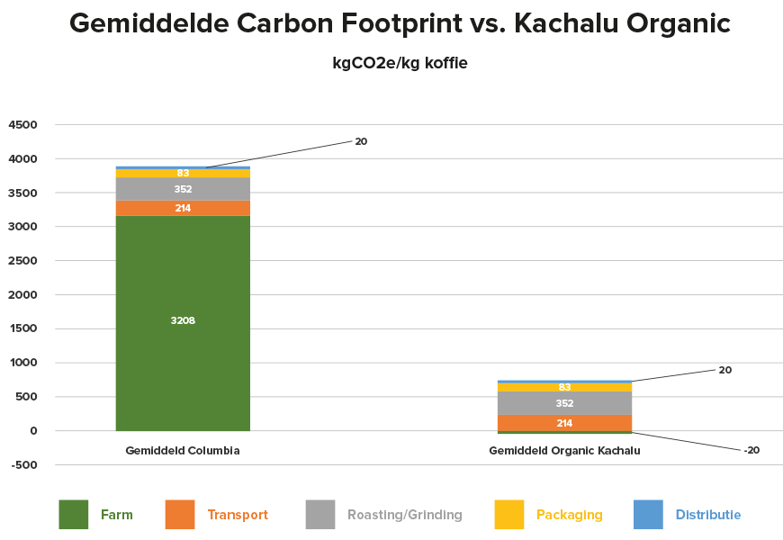 De Colombia Kachalu koffie heeft echter ruim 90% minder CO2 uitstoot op de plantage dan de gemiddelde Colombiaanse koffie. Dat komt omdat de boeren biologisch verbouwen en dus geen kunstmest gebruiken. En men heeft schaduwbomen geplant: dat is beter voor de koffieplant én slaat juist CO2 op.