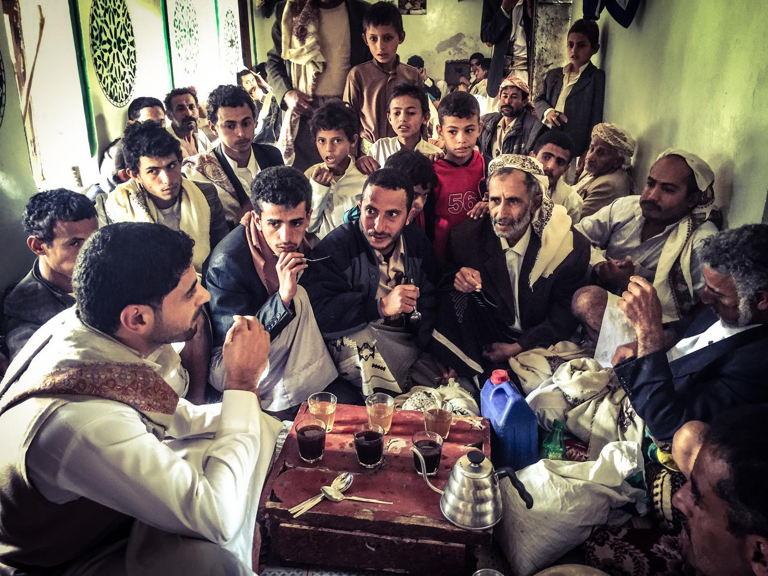 'Een halfjaar geleden, en na deze boektournee ga ik gelijk weer. Ik probeer drie keer per jaar te gaan. Er is één vliegveld in gebruik, inmiddels, waar eens per week een vlucht vandaan gaat. Dus het reizen is iets makkelijker geworden. Iets, want ik moet nog steeds vaak van slaapplaats wisselen, ik reis in een bewapend konvooi. Mijn familie behoort tot een grote stam, dat maakt het iets veiliger. Zelf draag ik daar ook een wapen, ook al hou ik helemaal niet van wapens. Jemen is na de VS het land met de meeste wapens per inwoner, wist je dat? Het verschil is dat je in Jemen echt een wapen nodig hebt. Ook omdat ik vaak reis met grote sommen contant geld.'
